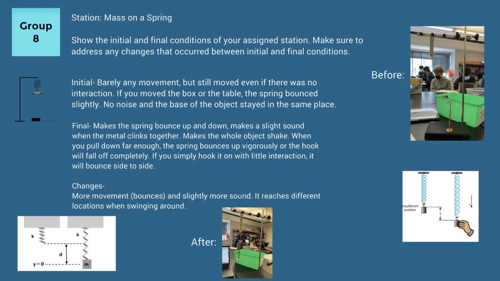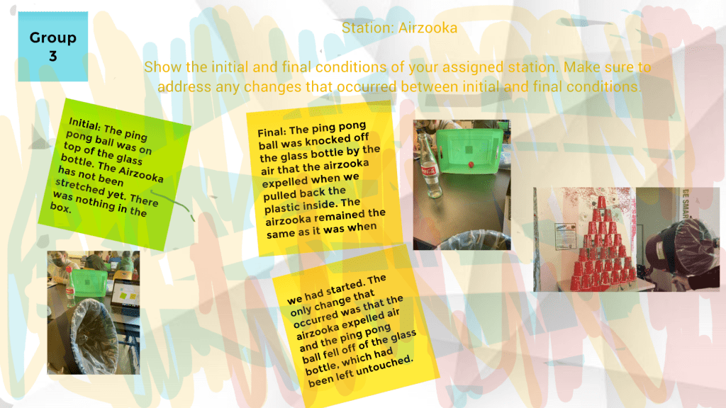 For Part 2 stations, I picked the more exciting three stations: Airzooka, Mass on a Spring, and Ball Drop. I gave the groups 3 minutes and 6 seconds at each station. After the rotation, we gathered back together to complete our whiteboards (which I did on Jamboards again). I told them about how Mrs. F and I have an informal competition going on and we’re constantly striving to show each other how excellent our students’ works are. So I encouraged them to show some pictures of the initial condition, final condition, and the changes in between.