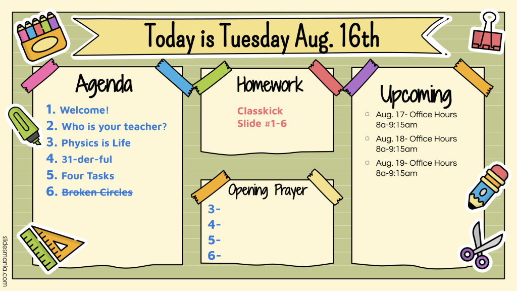 One of the students from Block 5 pointed out that I never said my name…and they came up to me privately requesting that I say my name so that they know how to pronounce it. How thoughtful are my new students! Then I showed the Physics is Life video that Mrs. F and Mr. M introduced to my first year of teaching Physics. It just doesn’t feel like the first day of school unless we show it.