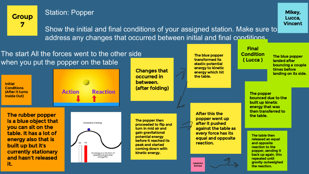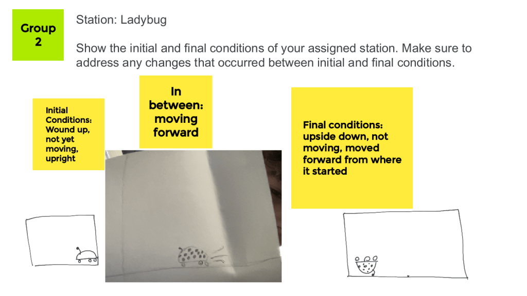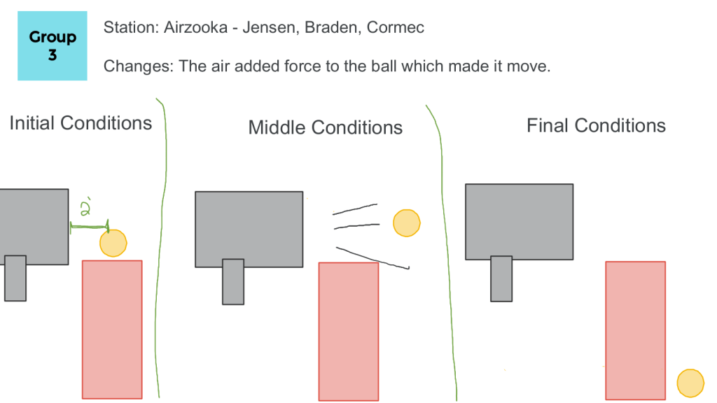 Then after the assessment, we did the presentations from Part 1 of Observation Stations. The jamboards had varying levels of detail. Some groups offered Newton’s 3rd Law (and there was a call and response during the presentation) while others kept it simple. There seems to be more motivation this year to show off the language learned in previous science classes. When I explored their use of physics vocabulary, there were definite misconceptions. I will need to take note about their misconceptions so I can address them in later lessons.
