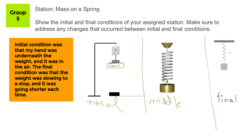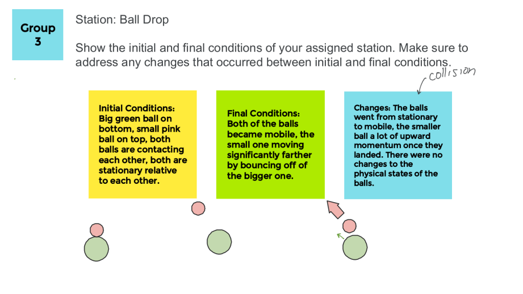 We then finished the rest of the Observation Stations. Since we were pros at it by now, the rotations went quicker and students were able to discuss the initial, middle, and final conditions with more confidence and speed. I appreciate that they were using trying really hard to keep it to conditions, but some started to veer off to explain WHY things were happening. There were students who were excited to use momentum, energy, and force in their explanation. I did not do as great of a job at refocusing them to concentrate on their direct observations. There were a lot of inferences going on. I wonder if I should include that in their assessment.